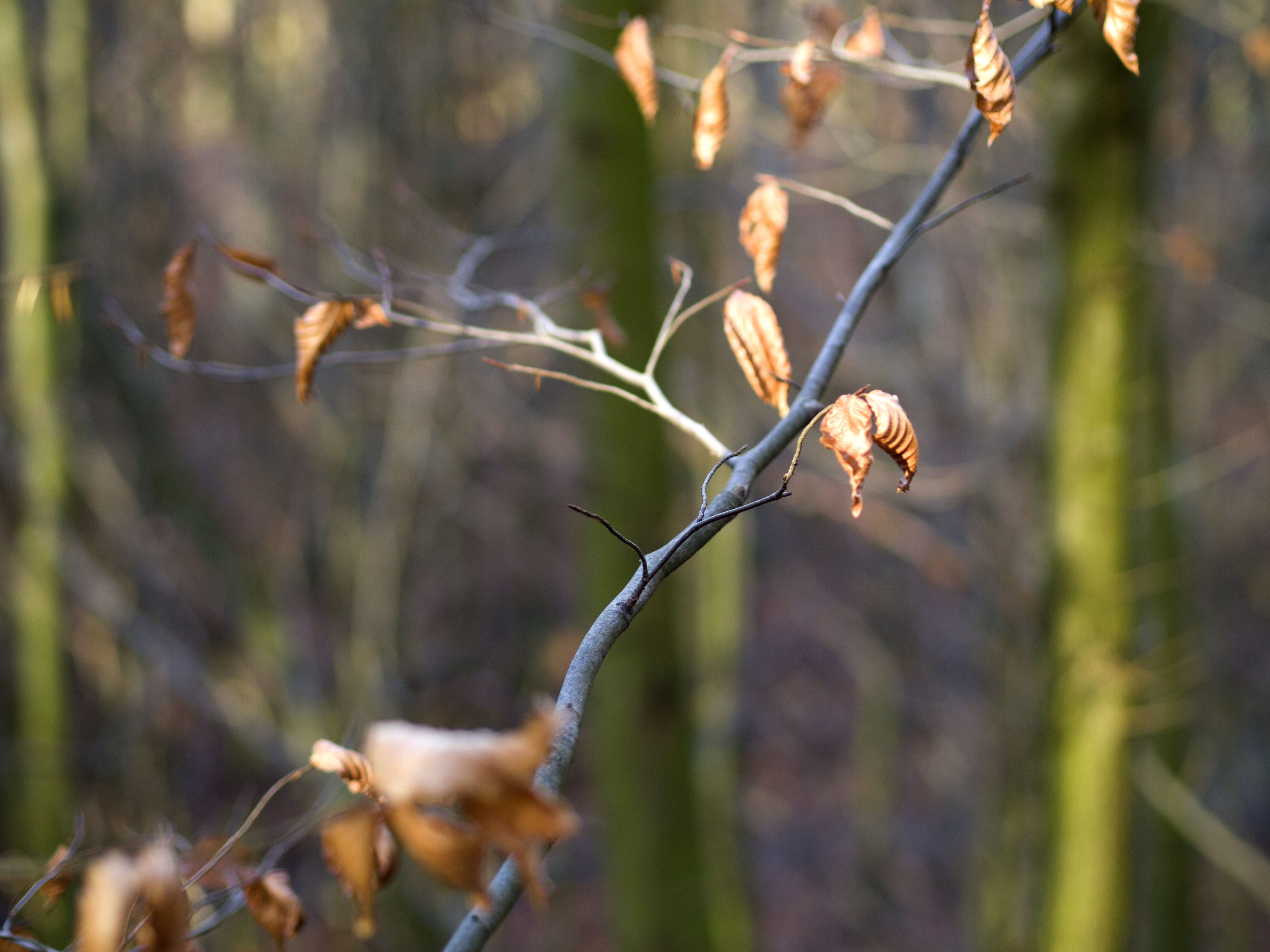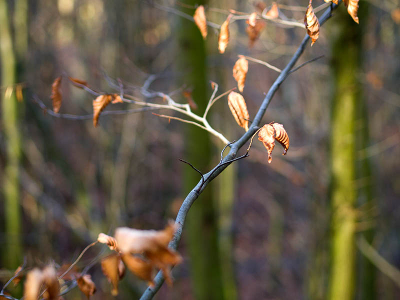 Anders sieht es mit Objekten im unscharf abgebildeten Vordergrund aus. Im linken Bildausschnitt unten zeigen sich an den Ästen deutliche Artefakte und Doppelkonturen, was nicht so schön ist. Dieses Abbildungsverhalten könnte einer sphärischen Unterkorrektion geschuldet sein, die durchaus beabsichtigt sein mag. Der etwas „nervöse“ Vordergrund wird so einem gleichmäßigeren Hintergrund geopfert. Da die Darstellung des Hintergrunds allgemein höher bewertet wird als die des Vordergrunds, ist eine solche Abstimmung durchaus plausibel, solange die allgemeine Bildwiedergabe nicht leidet. Fazit: Alles in allem gefällt mir das Bokeh des 45ers recht gut.